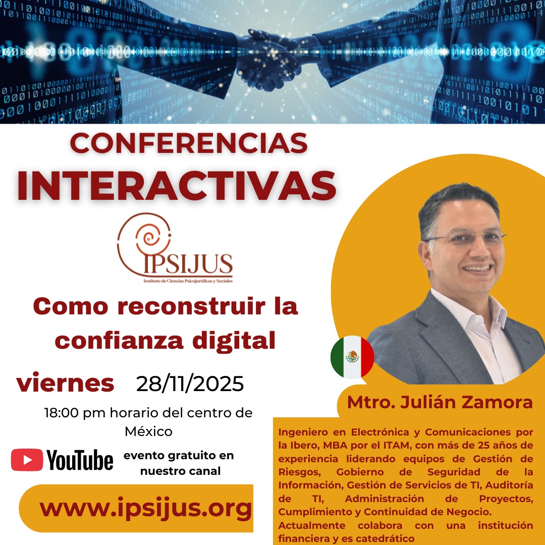 IPSIJUS TE INVITA A LA CHARLA VIRTUAL Como reconstruir la confianza digital Imparte Mtro. Julián Zamora Gratuita en nuestro canal https://youtube.com/@ipsijus Si deseas constancia de participación tiene un costo de $300 o 15 dlls Escribe por cualquier duda https://wa.me/525621397905